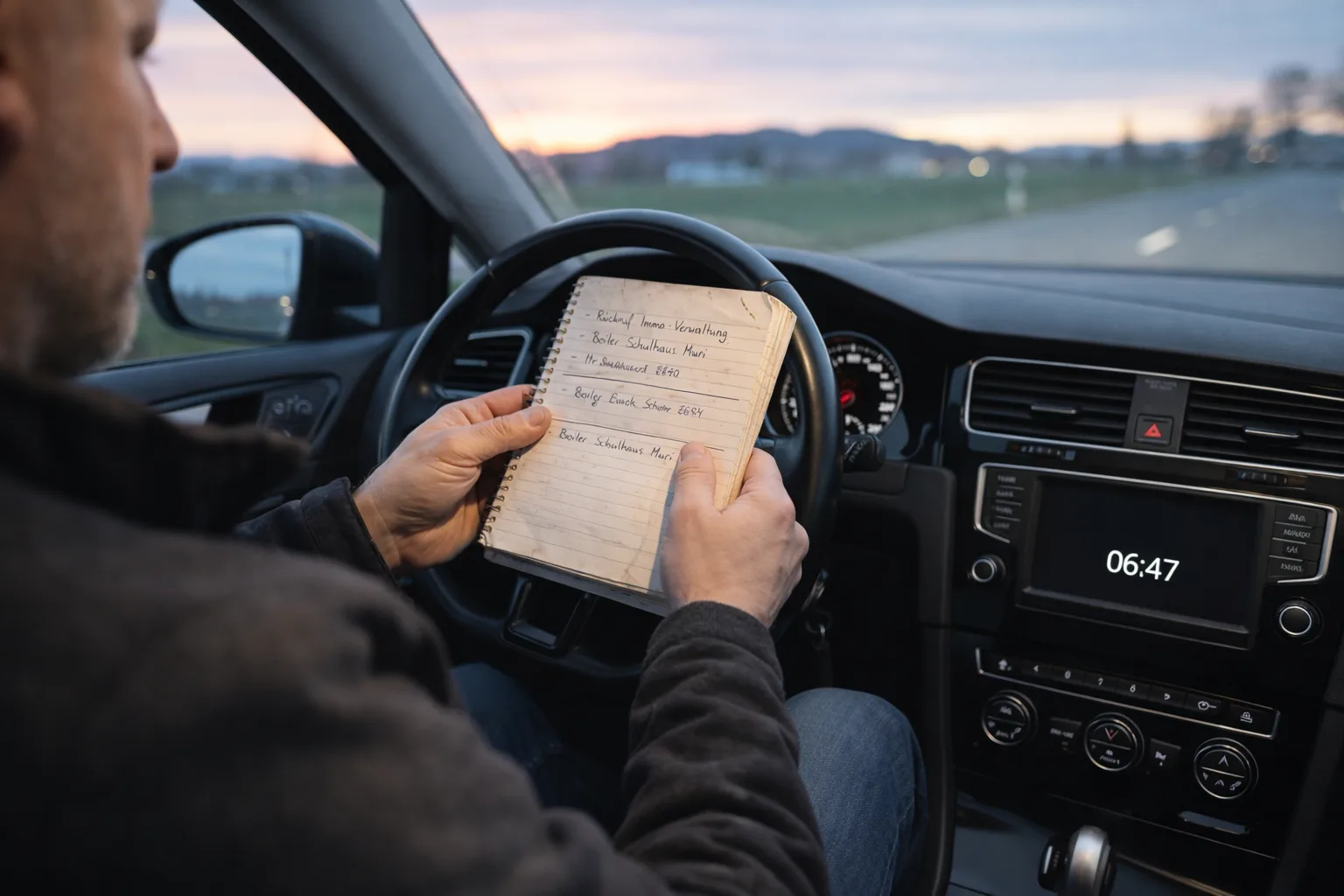 06:47 Uhr. Markus sitzt im Auto. Nicht weil er zu spät dran wäre – sondern weil er vor den anderen im Büro sein will. Bevor die Telefone anfangen. Auf dem Beifahrersitz liegt sein Notizbuch. Darin stehen keine strategischen Ziele, sondern: Rückruf Immo-Verwaltung Leuthard. Boiler Schulhaus Muri. Lukas ansprechen wegen Pikett.